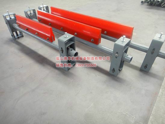 The first polyurethane cleaner is installed on the smooth surface of the conveyor belt in the range of 15 ° -30 ° from the transverse center of the head roller. It is the replacement product of the existing alloy cleaner on belt conveyors. The scraper selected polymer polyurethane material, wear-resistant, anti-corrosion, anti-fracture, hydrolysis resistance, no damage to tape, extend the tape life. The scraper has a spring tension adjuster, when the scraper wear or belt beat will automatically follow the blade surface, compensation, to ensure that the blade surface and close contact with the belt in order to achieve good scraping effect.